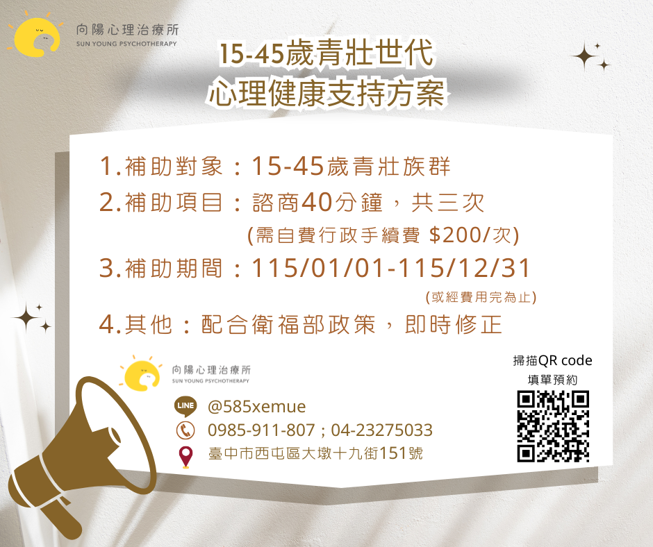 #心理諮商 #諮商 #諮商補助 #心理治療 #補助 #年輕人 #自我照顧 #自我探索 #情緒調適 #感情問題 #焦慮 #憂鬱 #家庭議題 #伴侶關係